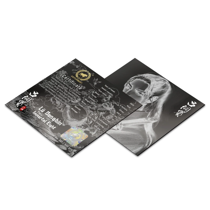 Stříbrná mince Niue: Eight Immortals – Lü Dongbin barevná, pozlacená 2 unce stříbra 2023 Ultra High Relief Antiqued Coin je druhý exemplář ze série "The Immortal Eight". Lü Dongbin je jedním z nejznámějších osmi nesmrtelných v čínské mytologii a taoismu. Je často zobrazován jako učenec, který nosí meč na odhánění zla a vějíř. Je uctíván nemocnými a respektován jako učenec.