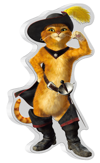 Rewers srebrnej monety ukazuje kolorowanego Kota w Butach.