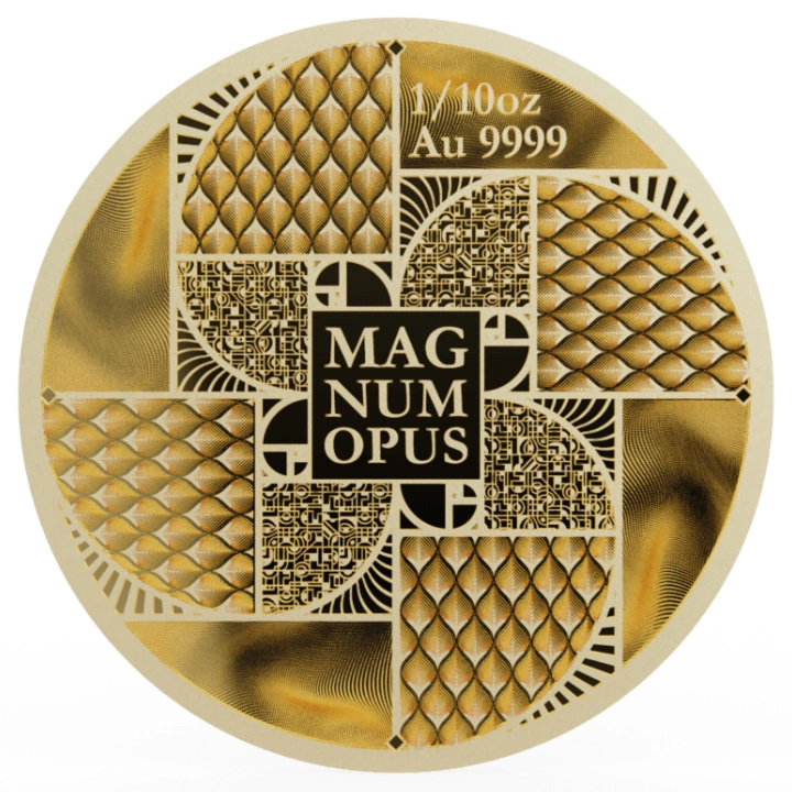 Na rubové straně jsou zobrazeny překrývající se geometrické tvary a nápis „MAGNUM OPUS“. Na rubové straně je rovněž uvedena hmotnost a ryzost slitku.