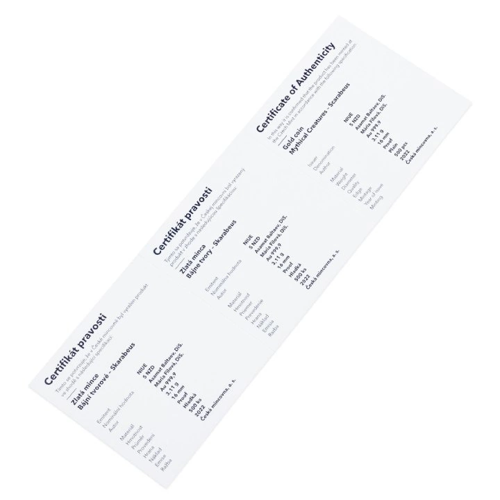 Niue: Mýtická stvoření - Scarabeus 5 USD Gold 2022 Proof je dvanáctou mincí ze série „Mýtická stvoření“. Mince představuje Scarabea. Brouk skarabeus byl jedním z nejuctívanějších tvorů mezi starými Egypťany. Skarabeus přinášel štěstí a byl v egyptské společnosti všudypřítomný.