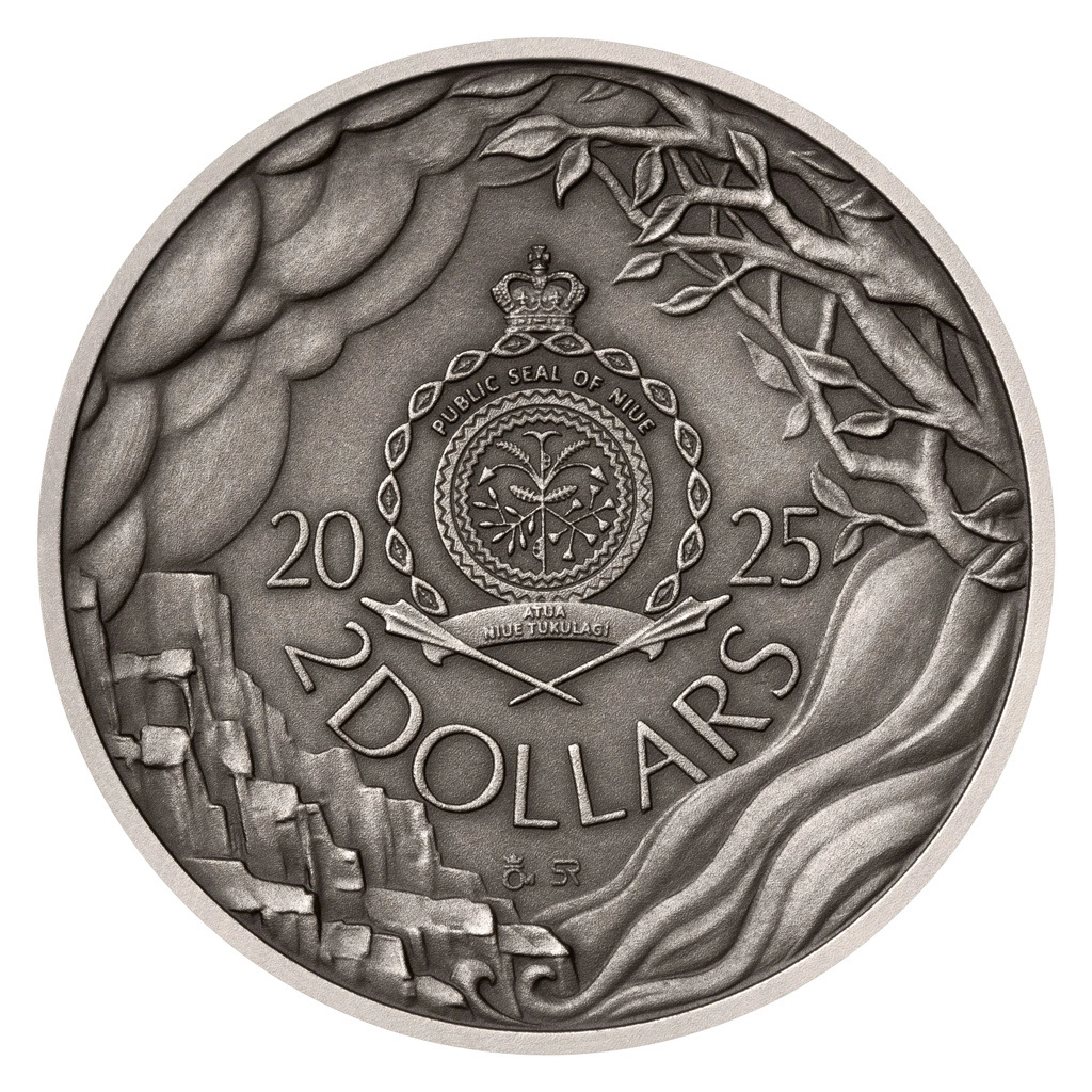 Avers zobrazuje státní znak Niue spolu s nominální hodnotou 2 NZD a rokem emise 2025.