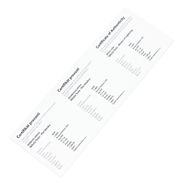 Niue: Nikola Tesla - Master of Lightning $1 Silver 2023 Proof je druhou mincí ze série „Nikola Tesla“ věnované životu a dílu geniálního vynálezce Nikoly Tesly. Tento vědec vystudoval matematiku a fyziku. Zabýval se výzkumem elektřiny a objevil princip střídavého proudu.