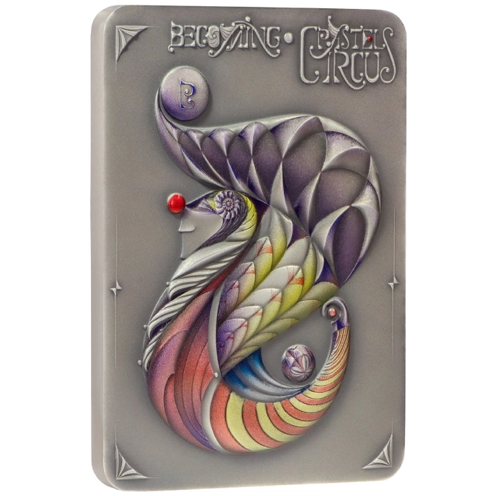 Niue: Pastel Circus - Becoming coloured $5 Silver 2024 High Relief Antiqued Coin je čtvrtou mincí ze série „Pastel Circus“ věnované symbolice cirkusu, ale také cestě člověka, který vytrvale následuje své sny. Mince představuje precizní ornamenty plné snových pastelových odstínů.