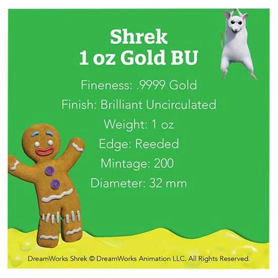 Rewers przedstawia słynnego Shreka wraz z osłem oraz napis "DREAMWORKS SHREK". Na rewersie znajduje się także informacja o wadze i czystości kruszcu.