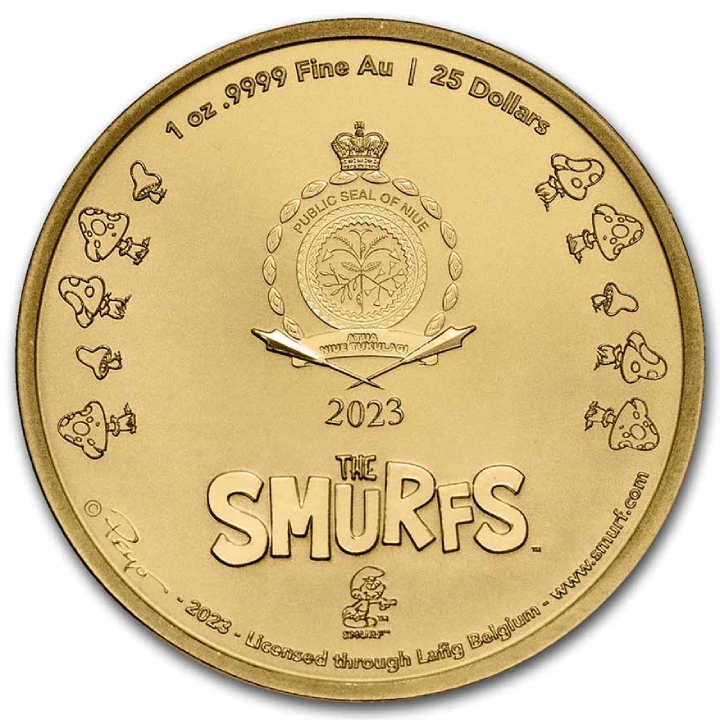Na lícní straně je zobrazen znak Niue (veřejná pečeť Niue), nápis „THE SMURFS“. Na averzní straně je rovněž uvedena hmotnost, ryzost slitku, nominální hodnota a rok ražby mince.