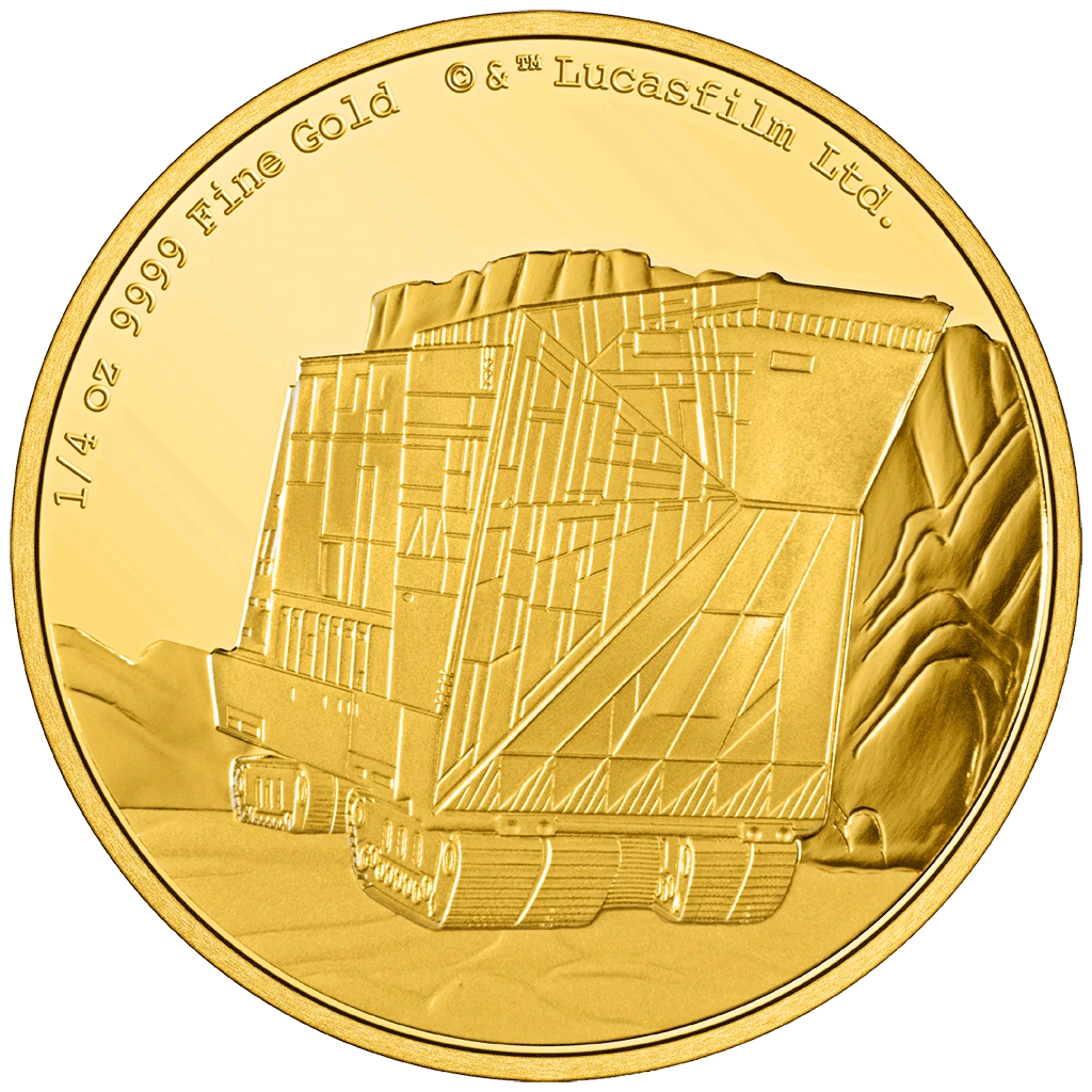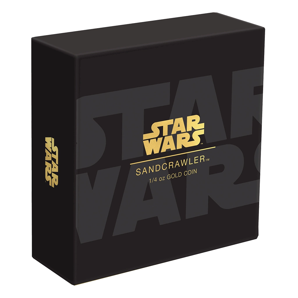 Niue: Star Wars - Sandcrawler 1/4 oz Gold 2022 Proof je druhou mincí z exkluzivní série mincí Star Wars Vehicles. Na minci z roku 2022 je zobrazen Sandcrawler neboli pásové vozidlo pohybující se po písečné planetě Tatooine. Vozidlo se objevuje ve čtvrtém díle Star Wars Nová naděje. Zlatá mince Star Wars je skutečnou lahůdkou pro fanoušky kultovní filmové série George Lucase, kteří hledají bezpečnou a osvědčenou investici. Mince byly vyraženy z ryzího zlata Au.9999 o hmotnosti 1/4 trojské unce a průměru 22 mm ve standardu proof.