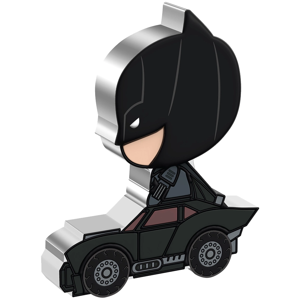 Reverz zobrazuje Batmana uhánějícího v Batmobilu ve stylu chibi, přímo odkazující na film „The Batman“. Barevný povrch skvěle vystihuje charakter postavy a umocňuje intenzitu návrhu, čímž vytváří atraktivní, sběratelskou minci ideální pro fanoušky Batmana.