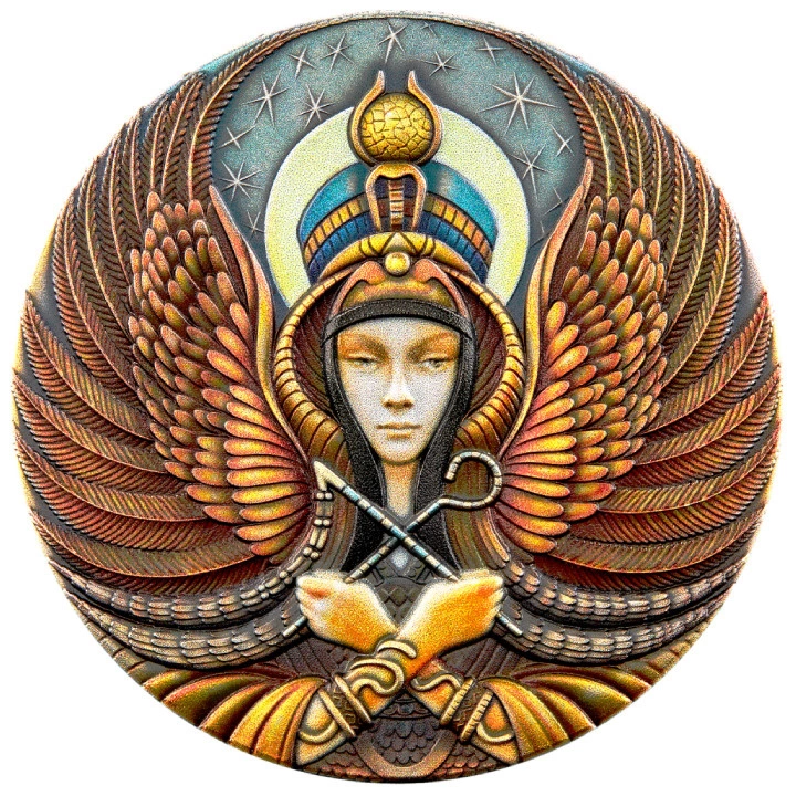 Reverz zobrazuje kolorovanou postavu bohyně Issis s křídly.