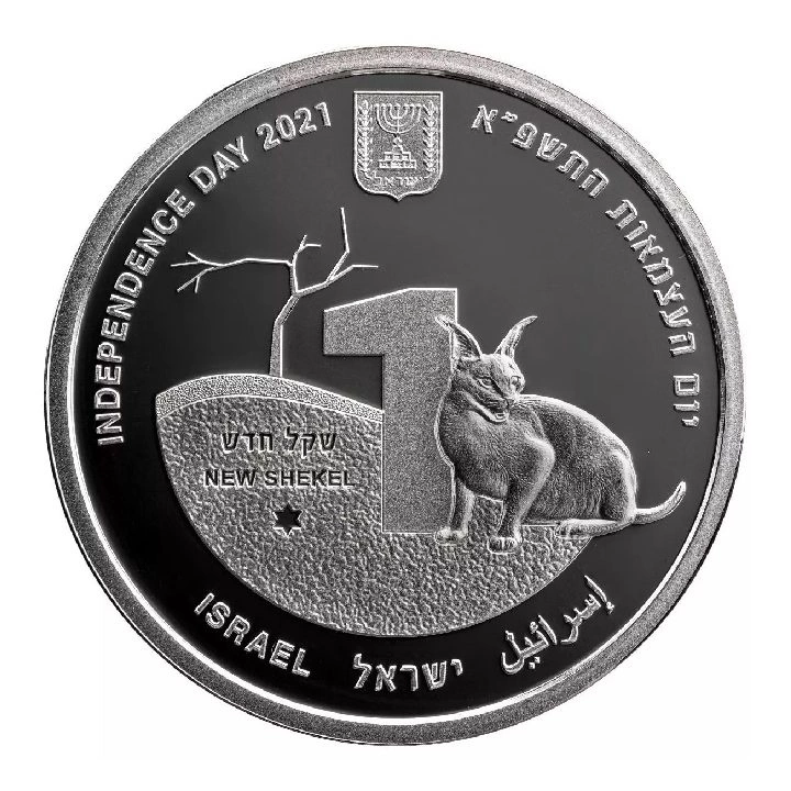Na averzní straně je zobrazen znak Izraele, karakal a nápis „INDEPENDENCE DAY 2021“. Na averzu jsou informace o nominální hodnotě, letopočtu a zemi původu napsané v hebrejštině, angličtině a arabštině. Kromě toho je na minci umístěna značka mincovny - Davidova hvězda.