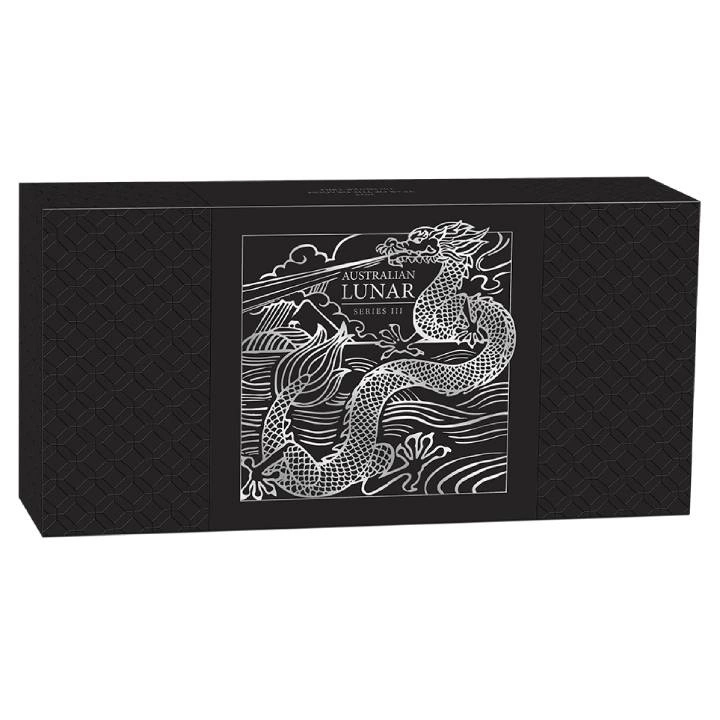 Sada obsahuje: Lunar III: Year of the Dragon 1 unce Silver 2024 Proof o hmotnosti 1 trojské unce a průměru 40,9 mm, Lunar III: Year of the Dragon coloured 1 unce Silver 2024 Proof o hmotnosti 1 trojské unce a průměru 40,9 mm a Lunar III: Year of the Dragon gold plated 1 unce Silver 2024 o hmotnosti 1 trojské unce a průměru 40,9 mm.