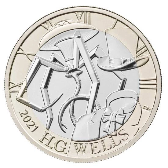 - H.G. Wells £2 Brilliant Uncirculated, moneta posiada stop miedzionikiel oraz nikiel-mosiądź, wagę 12 gramów, średnicę 28.40mm, nominał £2 .