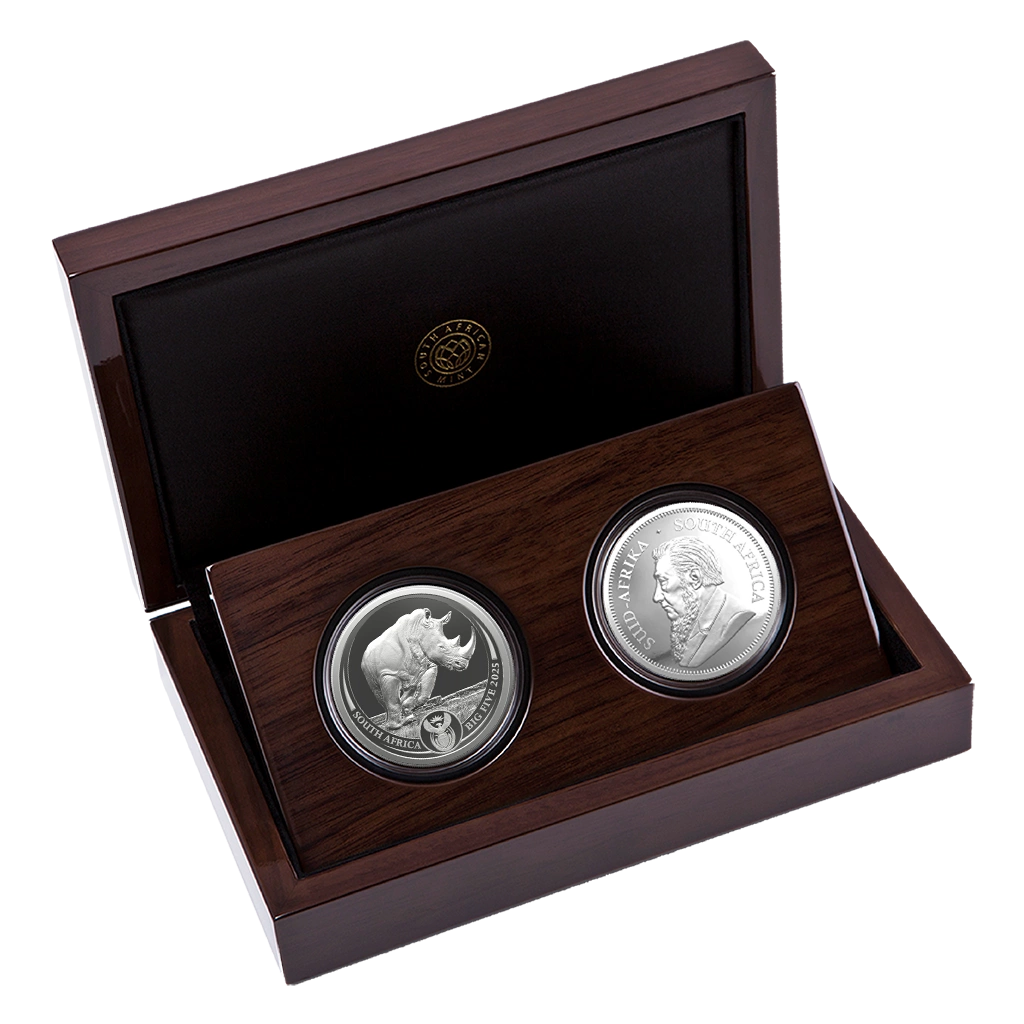 Sada Rhino/Krugerrand s motivem Rhino 2 unce Stříbra 2025 Proof je výjimečná kolekce dvou stříbrných mincí v kvalitě proof, každá váží jednu trojskou unci. Sada obsahuje klasického Rhina a speciální Krugerrand s diskrétním meničním znakem Rhino Privy Mark, zabalené v elegantní mincovní krabičce. Obě mince jsou vyrobeny z vysoce kvalitního stříbra Ag.999 a raženy v zrcadlovém proof provedení, které zvýrazňuje každý detail designu.
