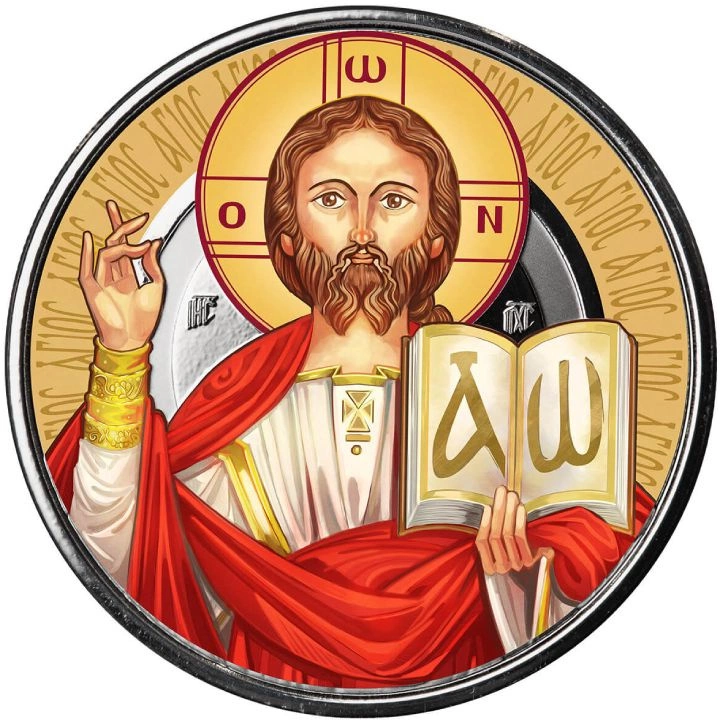 Na reverzní straně je vyobrazen kolorovaný Ježíš Kristus držící knihu se znaky „alfa“ a „omega“.