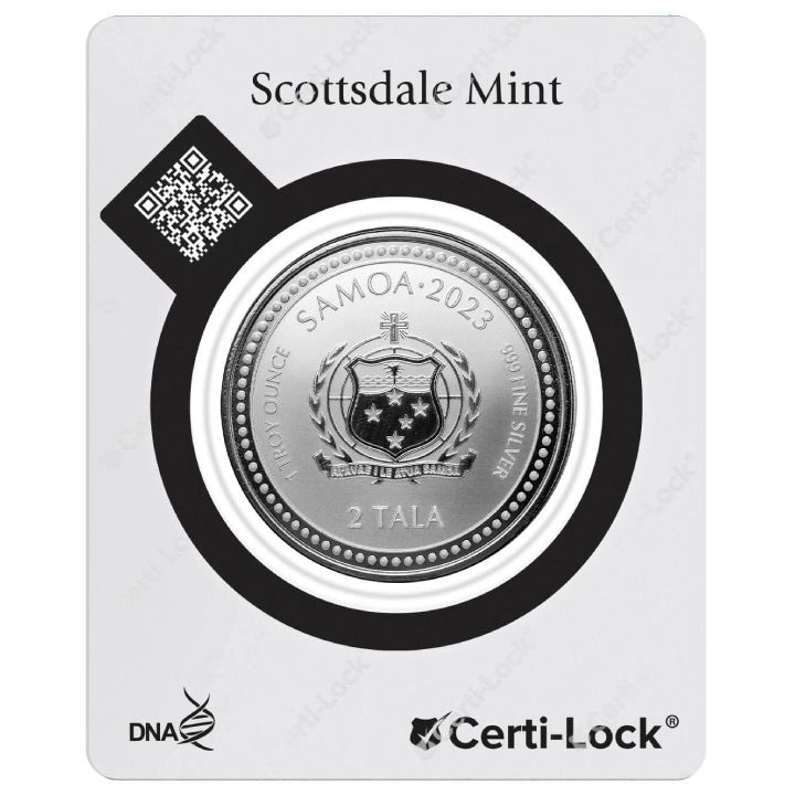 Na averzu stříbrné mince je vyobrazen znak Samoy a nápis „SAMOA 2023“. Na lícní straně jsou rovněž uvedeny údaje o zemi vydání, nominální hodnotě mince, hmotnosti a ryzosti slitku.