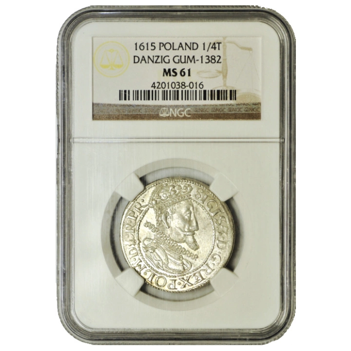Moneta Zygmunt III Waza. Ort Srebro 1615 NGC MS61 o nominale 1/4 Talara z 1615 roku.
