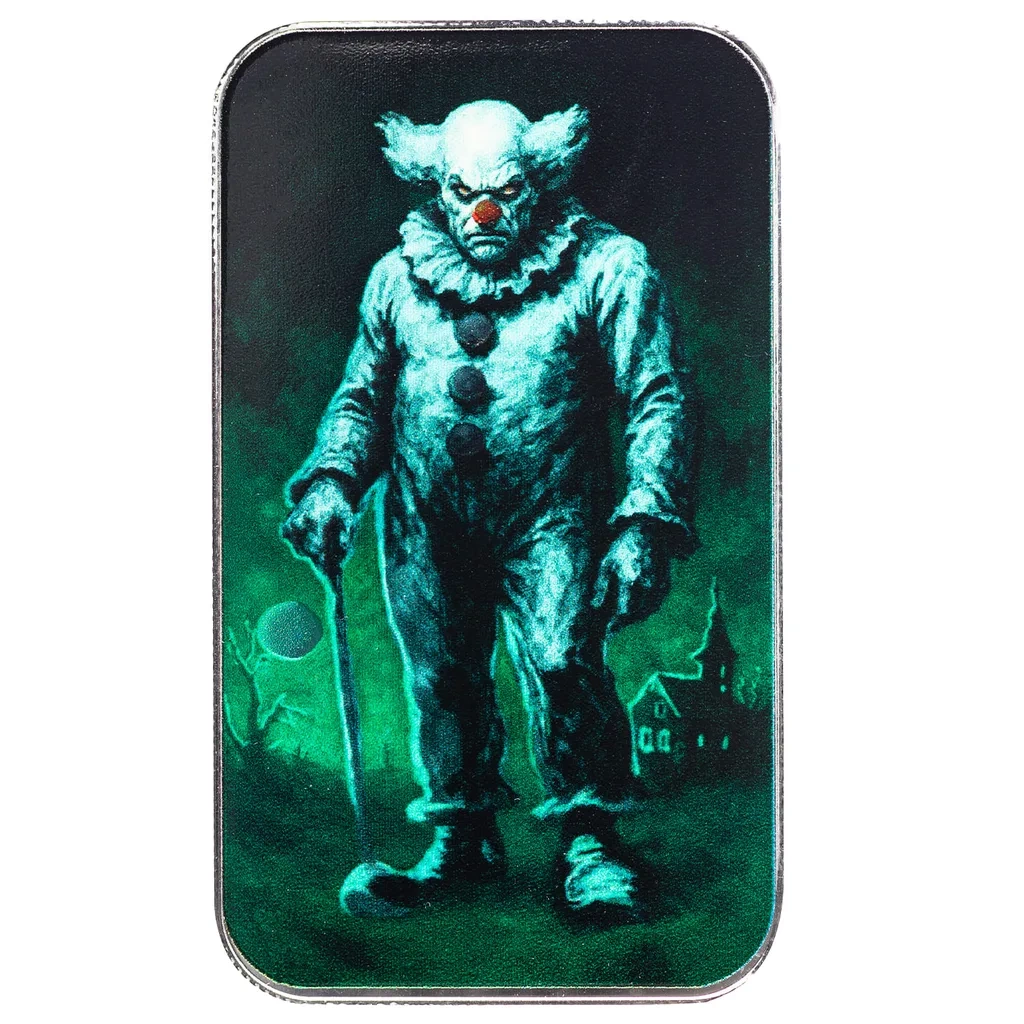 Přední strana zobrazuje výrazného klauna v plné barevnosti. Intenzivní barvy a temný komiksový styl zdůrazňují zlověstnou atmosféru postavy a každým detailem podtrhují Halloweenovou tematiku s precizním mincovním provedením.