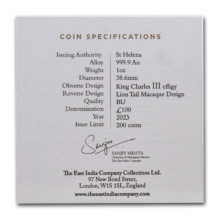 Zlatá mince Svatá Helena: Cash India Wildlife - Makaka lví ocas 1 oz Gold 2023 je další mincí ze série Cash India Wildlife. Na mincích této série jsou vyobrazeny poklady indické divoké přírody. Na tomto exempláři je vyobrazen makak lví ocasatý - druh primáta. Tato endemická opice se vyskytuje v jižní Indii.