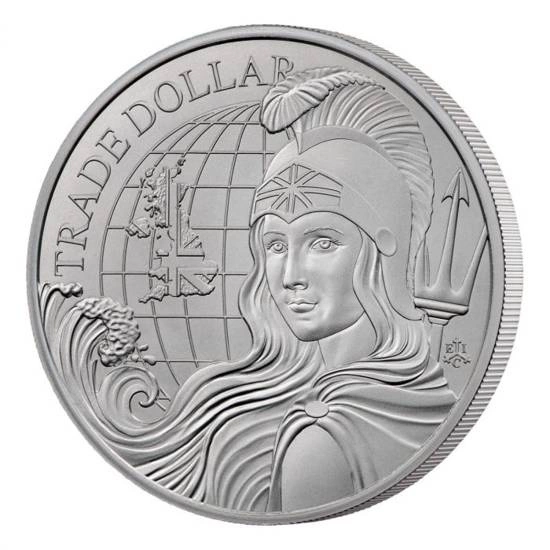 Na reverzní straně mince je zobrazena Británie a geografická vizualizace britského území. Na reverzní straně je rovněž nápis „TRADE DOLLAR“.