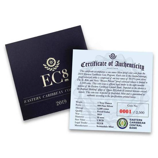 Mince Svatý Kryštof a Nevis: Kitts & Kitts: Brown Pelican coloured 1 oz Silver 2019 Proof je unikátním produktem, který zobrazuje pelikána hnědého. Tento pták nepatří mezi ohrožené druhy. Produkt je ze série Východní Karibik 8.