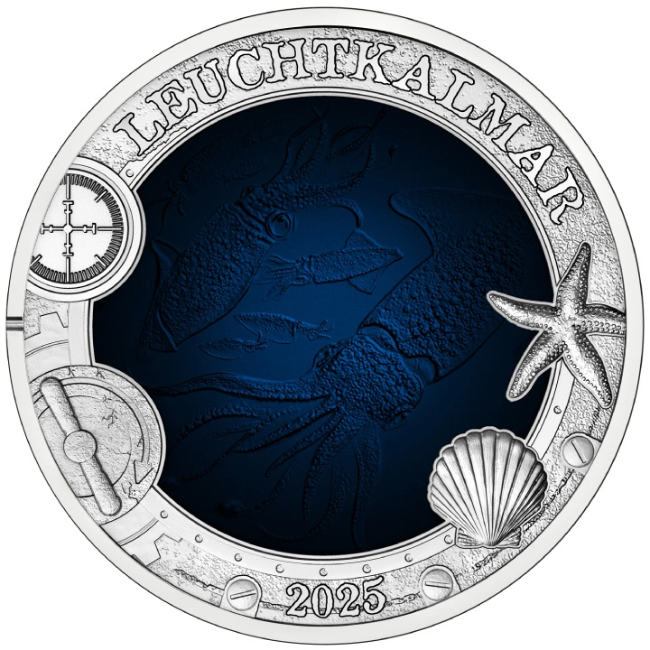 The Firefly Squid barevný 3 Euro Měď 2025 je desátým produktem ze série "Luminous Marine Life", která bude nakonec sestávat z 12 mincí. "The Firefly Squid", tedy světélkující kalmar, je bioluminiscenční hlavonožec, který obývá pobřežní vody Japonska, zejména zátoku Toyama, kde od března do května vytváří spektakulární modré iluminace.