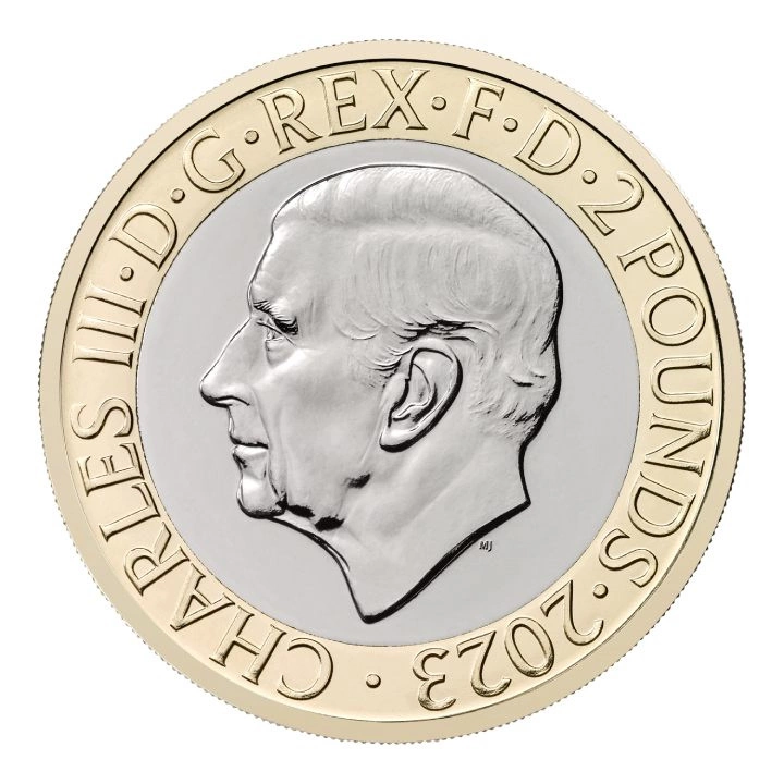 Na lícní straně je zobrazena podobizna britského krále Karla III. a nominální hodnota a letopočet podle návrhu Martina Jenningse.