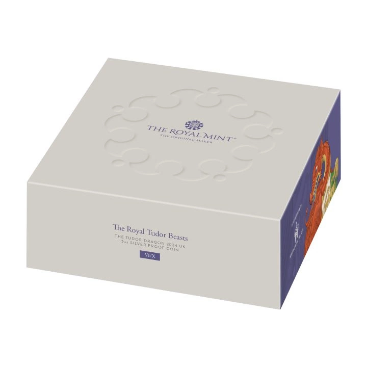 Královské tudorovské bestie: Tudorovský drak 5 oz stříbrná mince 2024 Proof je šestým kusem ze série The Royal Tudor Beasts. Jedná se o sběratelskou minci, na níž je zobrazeno jedno z deseti heraldických královských zvířat - tudorovský drak. Draci byli významnými symboly v období středověku a používal je Owen Tudor, pradědeček Jindřicha VIII. Jindřich VIII. se proto domníval, že tento symbol souvisí s Cadwaladrem, králem Gwyneddu ve Walesu, vládnoucím kolem let 655-682. Podle dobových rukopisů měl tudorovský drak červenou hlavu, hřbet a křídla a zlatou spodní stranu. Tento výrobek představuje zajímavý začátek série a umožňuje zájemce o britskou historii.