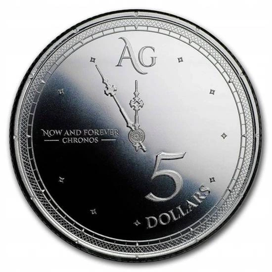 Na rubové straně je uveden čas 11:55, nápis „NOW AND FOREVER CHRONOS“, „AG“ a nominální hodnota mince.