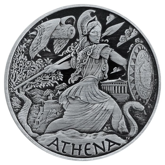 Tuvalu: Bohové Olympu - Athéna 1 unce stříbra 2022 Antiqued Coin