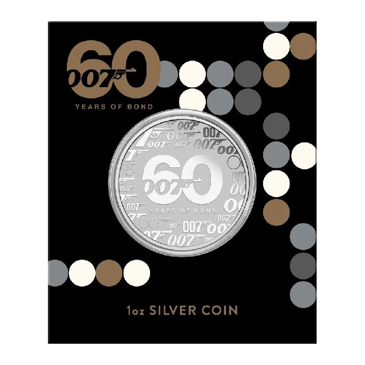 Na reversu stříbrné mince je zobrazeno ikonické logo agenta 007 a nápis „60 YEARS OF BOND“. Autorem reverzní strany je Sean Rogers.