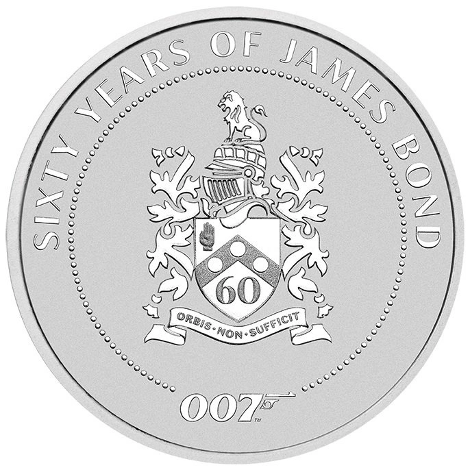 Na reversu stříbrné mince je zobrazeno ikonické logo agenta 007, erb a nápis „SIXTY YEARS OF BOND“.