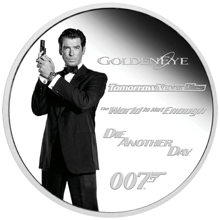 Na reversu stříbrné mince je vyobrazen Pierce Brosnan jako agent 007, revers navrhl Lucas Bowers.