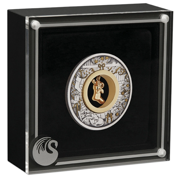 Přílohou je otočná zlacená dárková ponožka. Kromě toho je na něm vyobrazen věnec, girlandy zdobené barevnými cetkami a stuhami a spící zvířátka a pohoštění pro Otce Vánoc v jeho nejrušnější noci v roce, které navrhla Jennifer McKenna. Na rubové straně je rovněž vyražena značka mincovny The Perth Mint „P“.