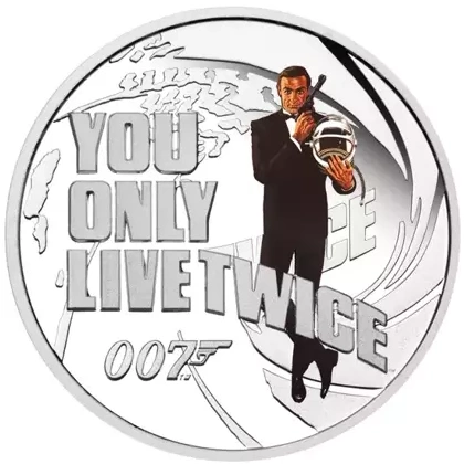 Rewers srebrnej monety przedstawia kultowe logo agenta 007 oraz napis "YOU ONLY LIVE TWICE", a także kolorowaną postać Jamesa Bonda.