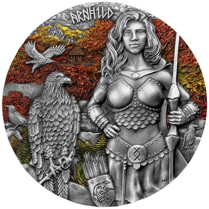 Čtvrtá a poslední mince ze série Valkyries. Tyto mince odkazují na ženy-bohyně, válečnice. Arnhild vychází z germánských bohyň, dcer Odina, které podle legendy podporovaly nejstatečnější válečníky padlé v boji. Postava symbolizuje zimní probuzení a sílu, představuje odhodlání v těžkostech. Její postava odráží duchovní připravenost a nezdolnost, stejně jako harmonii s přírodou, což je patrné v jejím spojení s vlky a symboly severské mytologie, jako je runa Ingwaz.
