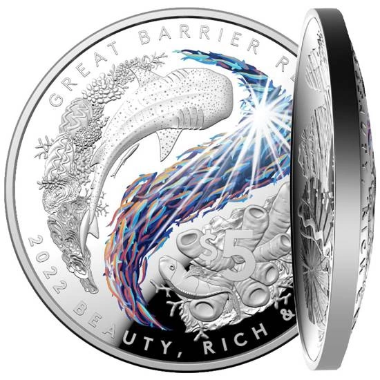 Na reverzní straně je zobrazeno pestrobarevné hejno ryb a výrazné prvky korálového útesu a nápis „GREAT BARRIER REEF“, „2022 BEAUTY, RICH & RARE“.