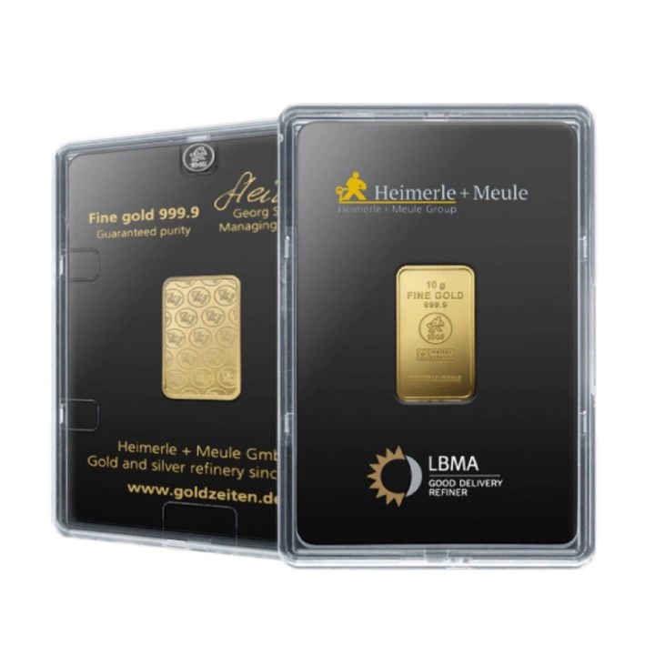 Každý desetigramový slitek Heimerle Meule je vyroben z čistého zlata ryzosti 999,9, což znamená obsah drahého kovu 99,99 %. Výrobek se vyznačuje precizním ražením, zaručujícím jednotnou tloušťku a hladké hrany. Na aversu slitku jsou základní identifikační údaje: název výrobce, hmotnost v gramech a ryzost kovu. Reverz obsahuje místo výroby – Pforzheim –, rok emise a podpis generálního ředitele jako dodatečné potvrzení autenticity. Slitek je dodávaný v bezpečném obalu CertiPack – speciálně navrženém certifikovaném balení, které chrání před mechanickým poškozením a umožňuje ověření obsahu bez porušení obalu. Systém CertiPack zaručuje originalitu výrobku a usnadňuje pozdější prodej, protože zachování původního balení zvyšuje důvěryhodnost slitku.