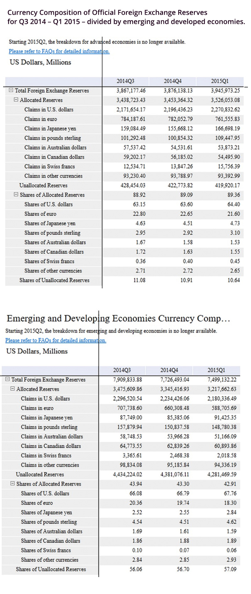 Going back to official reserves – would be fantastic to have official data for all advanced and developing economies. Problem is, that International Monetary Fund stopped publishing such divided data with the end of Q1 2015. Also, reserves by currency tend to be in many cases confidential due to sensitive nature of such data, hence it seems to be rather impossible to obtain such data for most of countries. However comparison of i.e. Q3 2014 – Q1 2015 is possible in the context of developed and emerging markets: