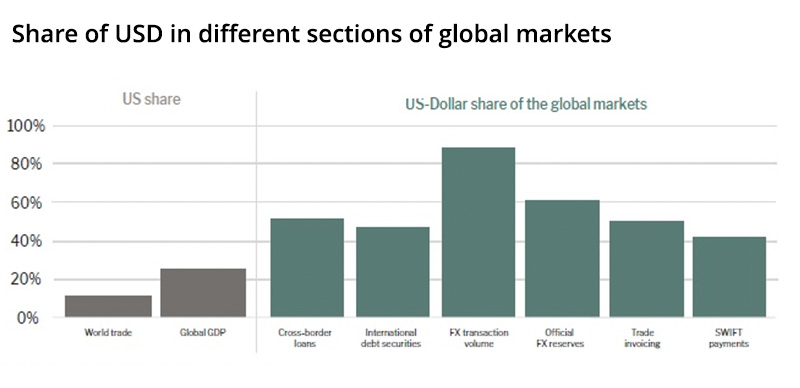 Share of USD in different sections of global markets. Source: S. Murau, F. Pape, T. Pforr, The Hierarchy of the offshore US dollar system on swap lines, the FIMA Repo Facility and Special Drawing Rights.