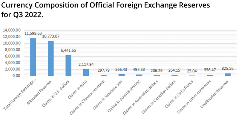 Mentioned earlier 12 trl USD in value of allocated reserves, had been a case basically since about a decade. In Q2 2011, world reserves pass cumulatively through 10 trl USD, to never fall again below. For the last decade, we oscillated in between 11- to nearly 13 trl in official reserves. Below dataset is being based on data provided by International Monetary Fund and reflects data for Q3 2022. On 11.5 trl USD we know exact allocation of 10.7 trl (92.88%) of total value. American dollar sits on 59.79%, which is slight recovery from bottoms reached in Q4 2021 at 58.81%. Euro has passed below 20% in Q2 2022 and now represents 19.66%. That inflicts demise on strength and influence of Eurozone. Pound Sterling (4.62%) bounced up little bit to 4.62% since 2020, and Japanese Yen continuous its decline (5.26%) along with long-term demise in value.