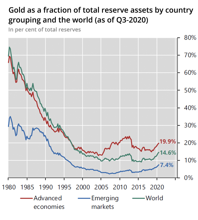 Gold continues to form an important part of many countries’ stock of foreign reserves. For the period since fall of Bretton Woods and Smithsonian Agreement – which was designed to be its successor - gold was being slowly replaced among reserve assets by other currencies. In 1991 cumulatively it was responsible for 25%. In 2001 it, as result of decades of sales it peaked to just 11%. According to 2020’s data from the International Monetary Fund, yellow metal constitutes 14.6% of total world reserves. One could say it kept stable share between 10-15% at least since the late 1990’s. However previous chapters clearly show that approx. 15% two decades ago vs 15% today means different volume, nearly by 7.5 times if not considering price factor. When doing so, increase in volume remains impressive.