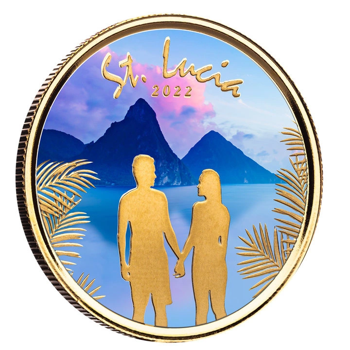 Die St. Lucia Couple Coloured 1 oz Gold 2022 Proof ist eine einzigartige Münze, die ein verliebtes Paar vor dem Hintergrund der Natur auf der Insel St. Lucia darstellt. Das Produkt stammt aus der Serie Eastern Caribbean 8.
