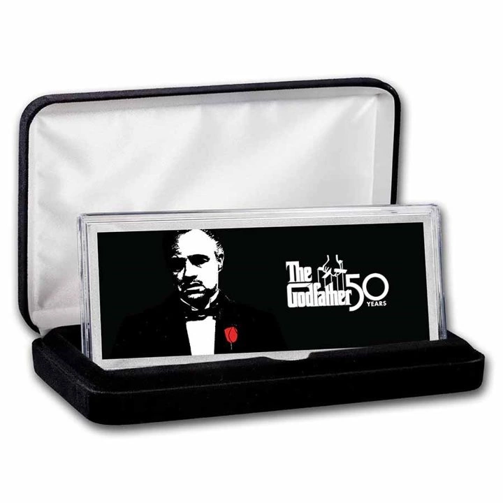 Der Godfather bar coloured 50th anniversary 4 ounce silver 2022 ist eine Hommage an den Film Godfather, der am 31. Dezember 1972 weltweit in die Kinos kam. Im Jahr 2022 feiert der Film den 50. Jahrestag seiner Verfilmung. Die Handlung des Films basiert auf dem Schicksal einer New Yorker Mafiafamilie.