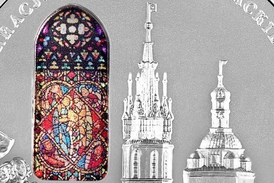 Srebrna moneta upamiętniająca 700 lecie konsekracji kościoła Mariackiego w Krakowie to ciekawa propozycja numizmatyczna, zaprezentowana przez Narodowy Bank Polski. Jest to egzemplarz, który został wybity z czystego srebra próby 999, o wadzę 62.2 gramów oraz w standardzie proof - bity lustrzanym stemplem. Charakterystycznym dla tej monety elementem jest projekt wizerunku, który zawiera kolorowy witraż. Ów witraż przedstawia w górnej części maswerk późnogotycki z motywami roślinnymi, w dolnej części postacie Józefa i Marii, ofiarowujących Dzieciątko Jezus w świątyni, a w środkowej części wizerunek postaci z predelli ołtarza Wita Stwosza.