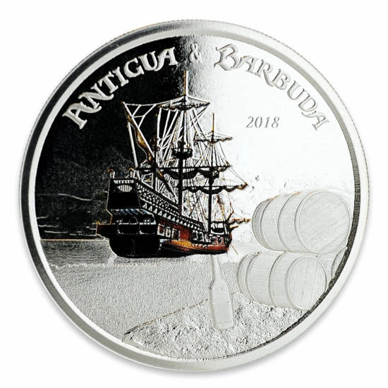 Auf der Rückseite sind eine Flasche, Fässer und das auslaufende farbige Schiff "Rum Runner" abgebildet. Auf der Rückseite sind außerdem die Inschrift "Antigua & Barbuda" und das Prägejahr der Münze zu sehen.