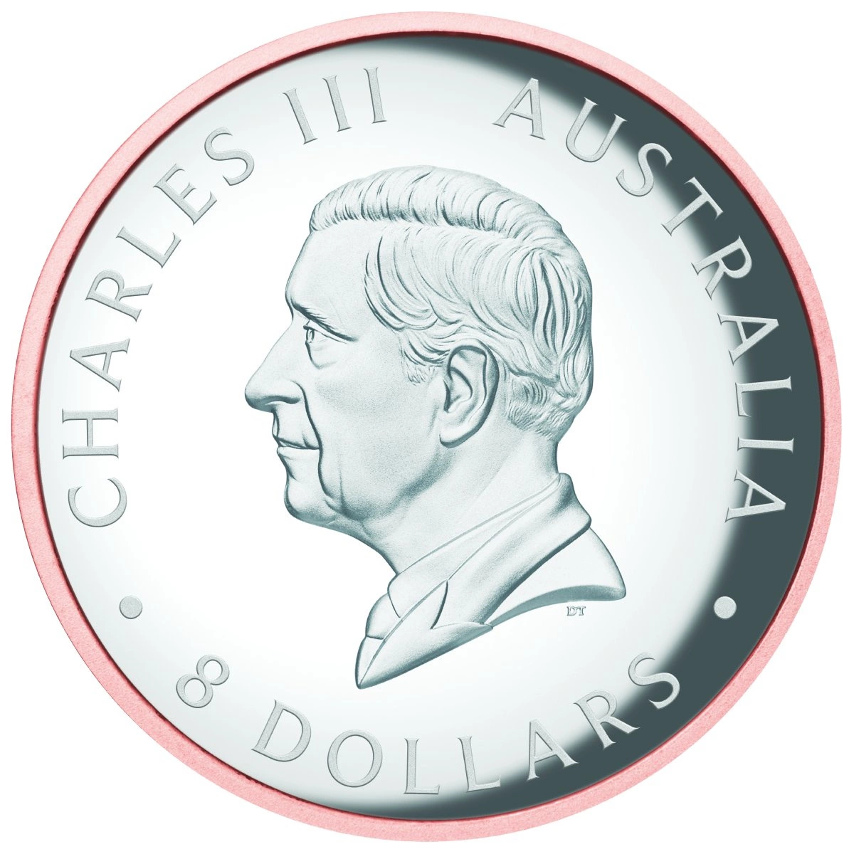 Die Vorderseite zeigt ein Porträt von König Charles III., umgeben von seinem Namen, dem Ausgabeland – Australien – und dem Nennwert der Münze, was ihren offiziellen Status und Sammlerwert hervorhebt.