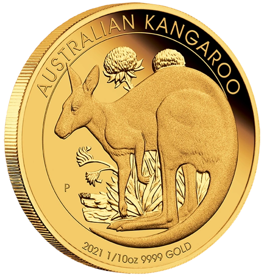 Złoty Australijski Kangur 1/10 uncji Proof to kolekcjonerska propozycja najstarszej australijskiej mennicy - The Perth Mint na rok 2021. Wspomniana moneta została wyprodukowana w standardzie proof (lustrzany stempel) z kruszcu próby Au.9999, o wadze 1/10 uncji trojańskiej.