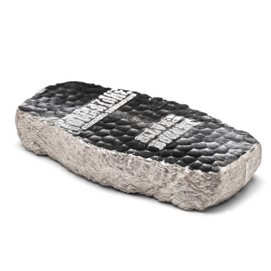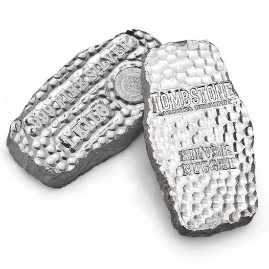 Das Produkt Tombstone Nugget 1.000 Gramm Silberbarren ist ein Exemplar, das einen unebenen Rand hat und von der Scottsdale Mint stammt. Diese Anlagequalität Produkt ist aus Ag.999 Sterling Silber geprägt und wiegt 1.000 Gramm.