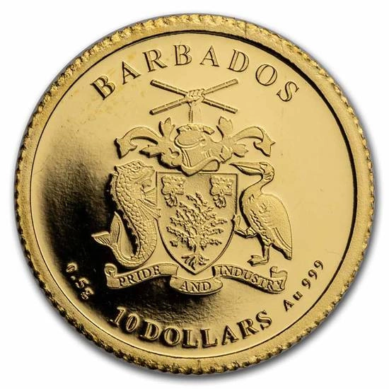 Awers złotej monety przedstawia herb Barbadosu wraz z informacjami o wadze, czystości kruszcu oraz wartości nominalnej monety.