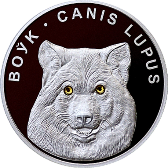 Awers monety przedstawia szarego wilka, jego oczy są ozdobione kryształami Swarovskiego.