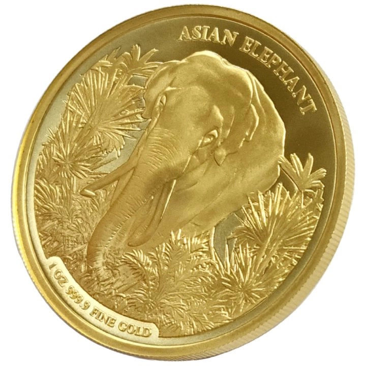 Die Rückseite der Goldmünze zeigt einen asiatischen Elefanten und die Aufschrift "ASIAN ELEPHANT", sowie das Gewicht und den Proof der Anlagemünze.